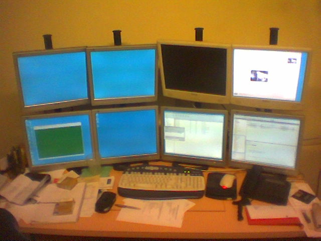 Stand UP. Flat panels for a burp. Networked PCs shareing one keyboard n mouse but independent flat panels for easy monitoring