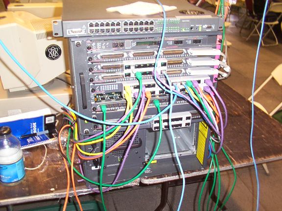 Another picture of illwill's setup at h2k2 conference. All smart routers and hubs of old time. When weird brains rule the machines you get pretty surprising output. He go up with a cool site on hacking stuffs but was once accused for hacking into many machines and trojanizing some programs supplied through his network. Smart monitoring spy got in for some time. But I do think his site is real cool.