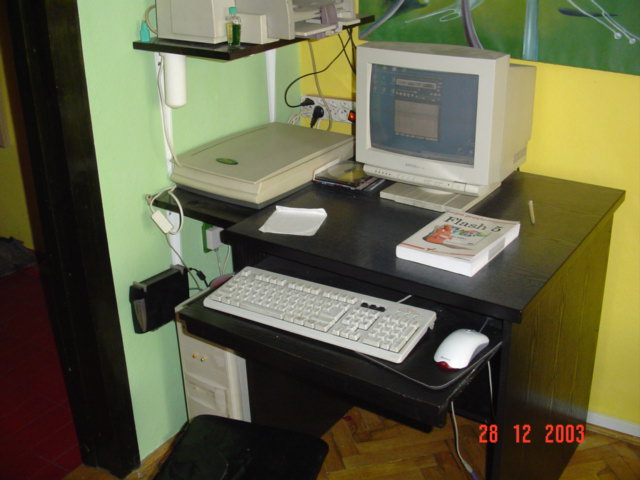 Simple home computer setup picture. Pretty neat and tidy setup for peaceful netlife powered with scanner, printer, cable modem.