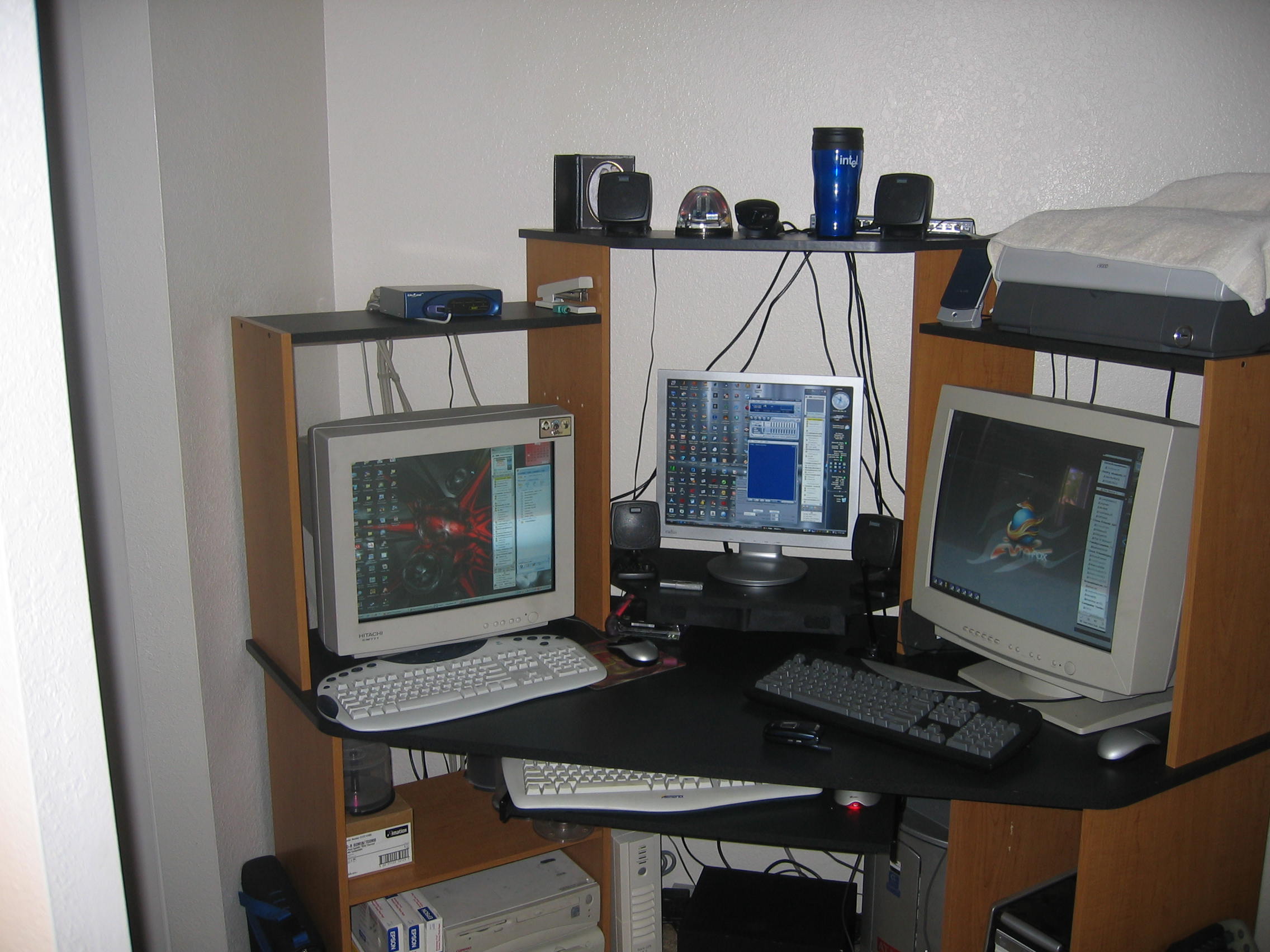 The New Arizona Computer Lab of Matrix3000k Enterprises. You can see clustered network machines down the table. Gathering small processing power for a giant filp flop. From right to left:- Computers server.matrix3000k.org-- Gateway E series. CPU: Pentium 4 Hyperthread 2.8GHZ Operating System: Suse Linux 9.3 Professional Memory: 1009.82MB IDE Devies: WDC WDA800JB 80Gig hard drive Sony DVD-RW DRU-500A HL-DT-ST RW/DVD Cypher.matrix3000k.org-- Customer Built CPU: AMD Athlon(tm) XP 2500+ Operating System: Microsoft Windows XP Professional Memory: 1.00 GB IDE Devies: Maxtor 120 GB Hard drive External WDC 120 GB hard drive WDC 120 GB hard drive Maxtor 40 GB hard drive Lite-ON DVD-RW 8x 50x cd-rom drive Gigabyte Motherboard with SCSI/RAID Zion.matrix3000k.org Server CPU: Pentium 3 950Mhz Operating System: Microsoft Windows 2003 Enterprises Server Memory: 512MB IDE Devies: WDC 80GB hard drive Maxtor 40 GB hard drive 50x cd-rom drive Personal details: Ethnicity: 100% Lebanese BABY!!!!!!!!!!!!!!!!!!!!! Hobbies: Computers, DJing, Art, sex, you know the usual stuff typical guys like.....hehehehehehe Occupation: Network and System Administrator and a student at Devry Universary online Origin: Tucson, Arizona Favorite TV Shows: Friends, Martin, Mad TV, Jaime Fox show, WWF Smack Down and Monday Night RAW baby Preferred Music: Rap, House, Techno, Dance, and lots and lots of club <---- since I am a Professional DJ - Mario Azar