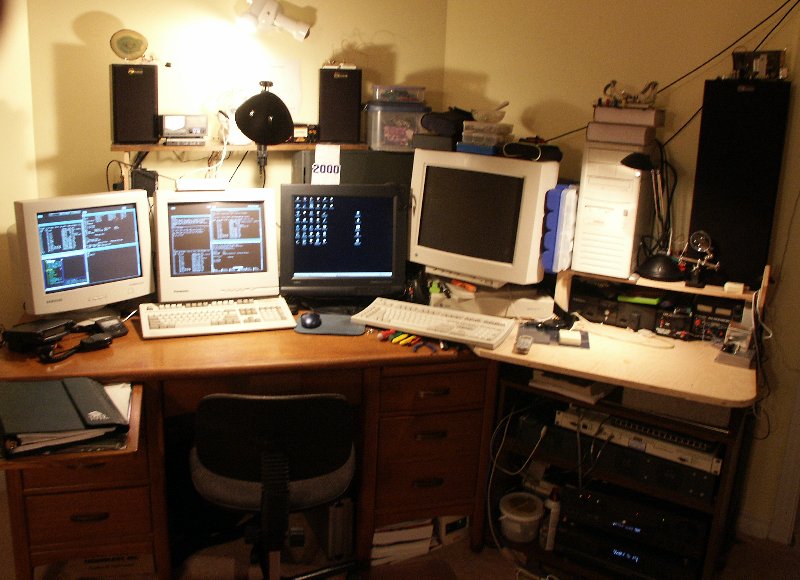 From Your Right to Left: [Front View] * Pentium 4 2.55GHZ with 512 Kb of cache: This is my Main workstation. 512MB of ram 18.2GB 10K Seagate SCSI hard drive - adaptec 29160 controller, Lite-On IDE cd burner. MSI Geforce4 64 MB AGP card, and second head runs on a ATI all in wonder 16MB PCI. This runs OpenBSD. Get the dmesg here. * Dual Pentium III 1000MHZ: This currently runs WindowsXP and OpenBSD. 512MB of ram, 40GB IDE HDD, Sony DVD player, Elite ATX case, GForce4 T1 4200 128MB of DDR video memory. * Pentium 333 Celeron: This is my Test Workstation. 256MB of ram, 13 GB IDE HDD. * SPARC Station 10: 50MHZ hyper SPARC, 32MB of ram, SCSI HDD. This currently runs OpenBSD. * 266MHZ Pentium II: 128MB of ram. This is currently my kernel hacking machine. * Sharp UV-30M: 866 Pentium M, 256MB of ram, 30 GB HDD, 802.11b. This currently runs OpenBSD and WindowsXP. * Dell 2400 server: 866MHZ, 384MB of ram, raid controller with three 18.2GB Hard Drives. This server runs OpenBSD. * 386 laptop: 2MB of ram, 60 MB HDD, broken power supply. This runs Free Dos. Other Gear that i own: * Cisco 2900 switch with 12 100Mbit Full Duplex Ethernet ports. * 17" NEC LCD monitor * Nuance speakers connected to a Technics Home Theater System. - sent by anonymous visitor
