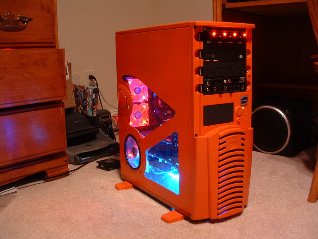 Red coated gaming rig with illuminated fan exhausts for sucking out overclocked heat. Internal illumination with LED and Ultraviolet party cold cathode tube and UV reactive components.