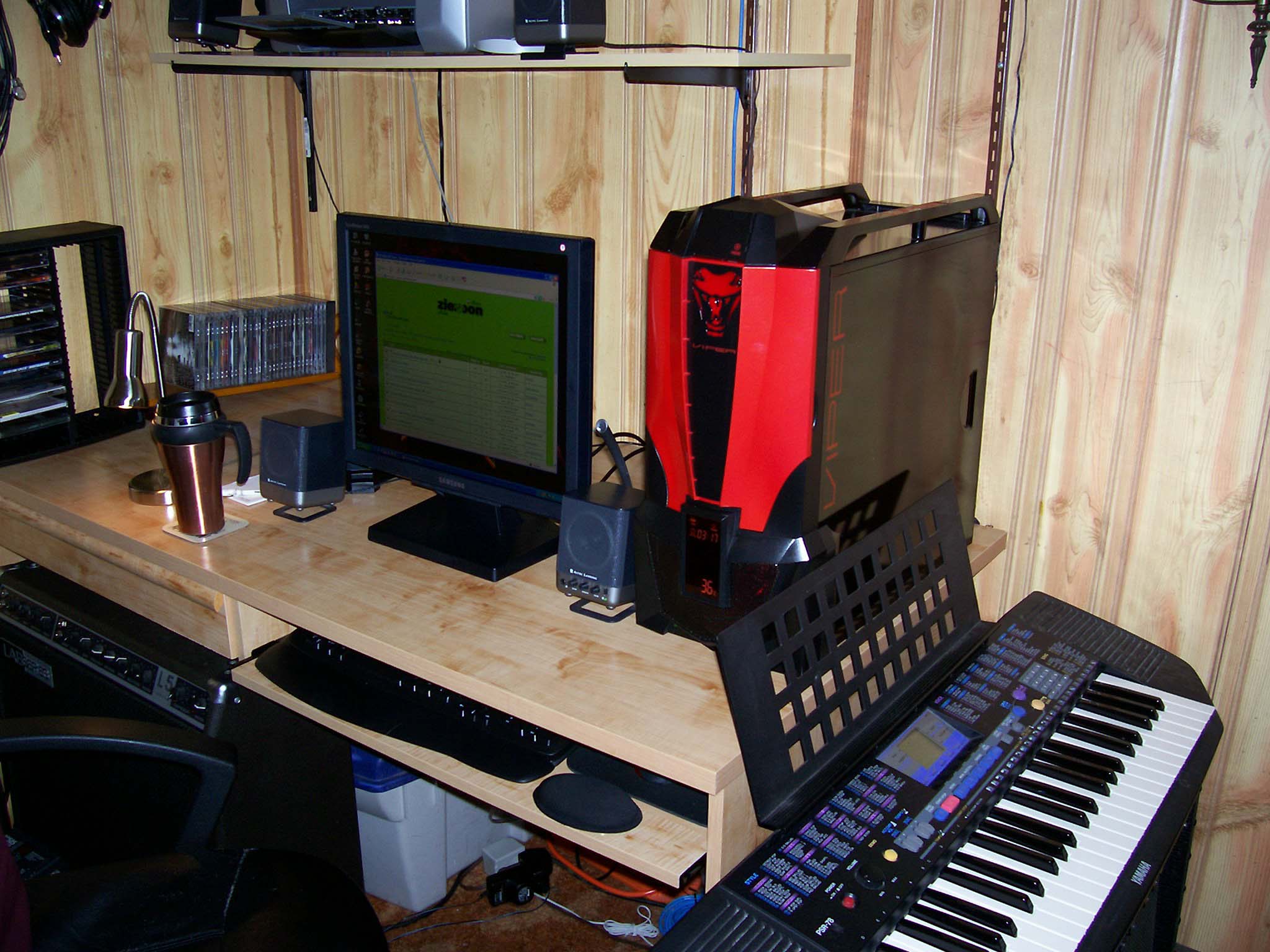 some pictures of my latest upgrade to my toys. This is my game, surf, music, and sometimes ~work~ setup. It's a P4-3.4 GHz on an ABIT AL8-V motherboard with 2GB (4 X 512) of Kingston RAM. Geforce 6600GT 128 meg videocard, Audigy 2 soundcard, DVD+/- R/RW/RAM etc combo drive, and Viper Case. Monitor is a Samsung SyncMaster 930b. Speakers are Altec Lansing 5.1, keyboard is Logitech, mouse is Microsoft Optical, joystick is Logitech. The printer is an Epson C88. This PC is one of seven on my wired home LAN. All PCs are Windows XP Home except for one P3 450 WIN98 machine I keep for old games and DOS. Yes, I still run DOS programs...older geek I am. - [ Name and Email Withheld due to request ]